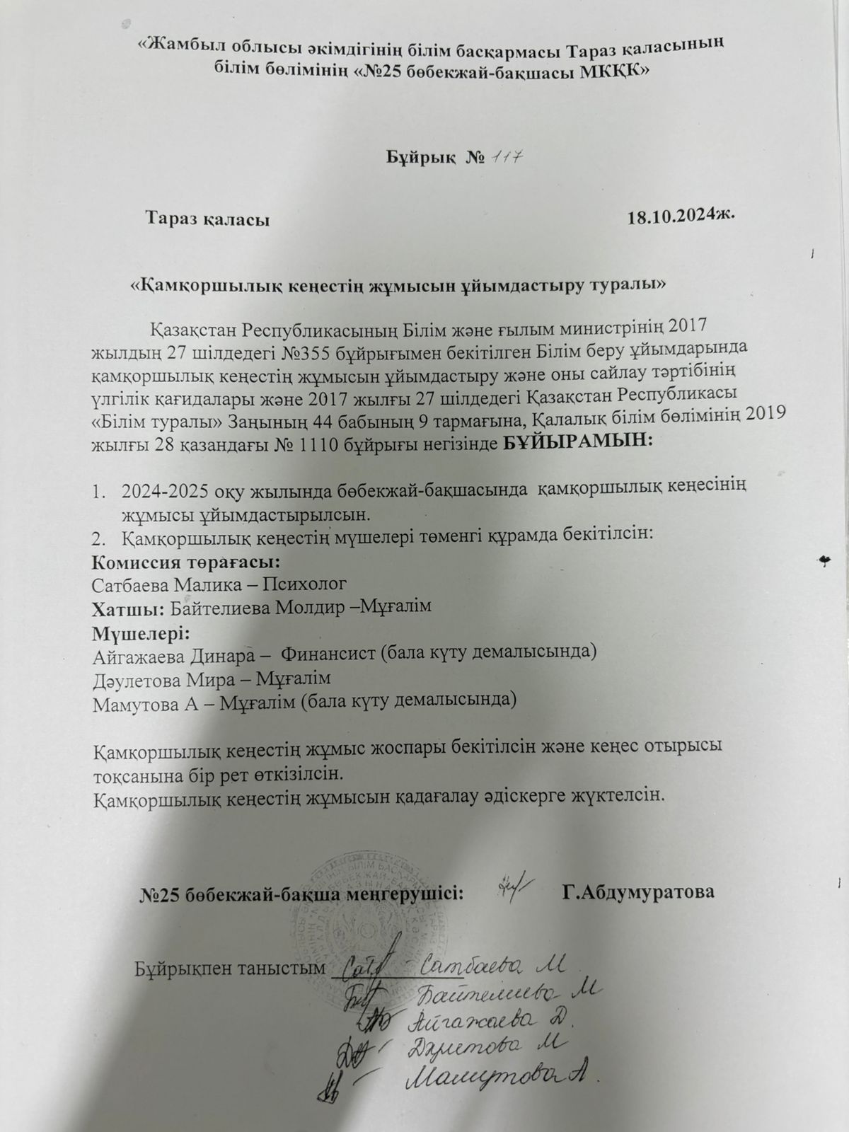 Қамқоршылық кеңестің жұмысын ұйымдастыру туралы » «№25 бөбекжай –бақшасы