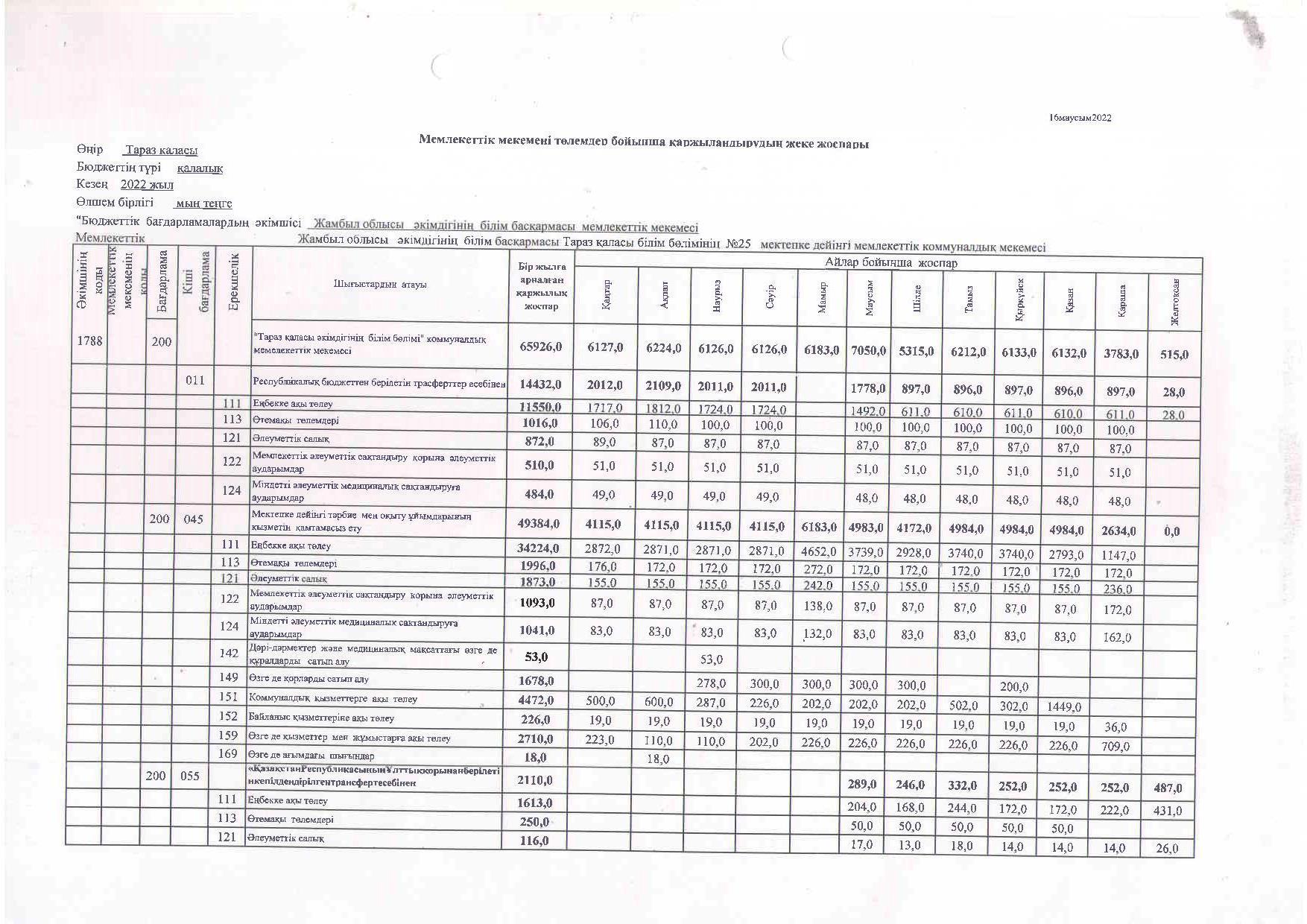 Жеке қаржыландыру жоспары 16.06.2022 » «№25 бөбекжай –бақшасы