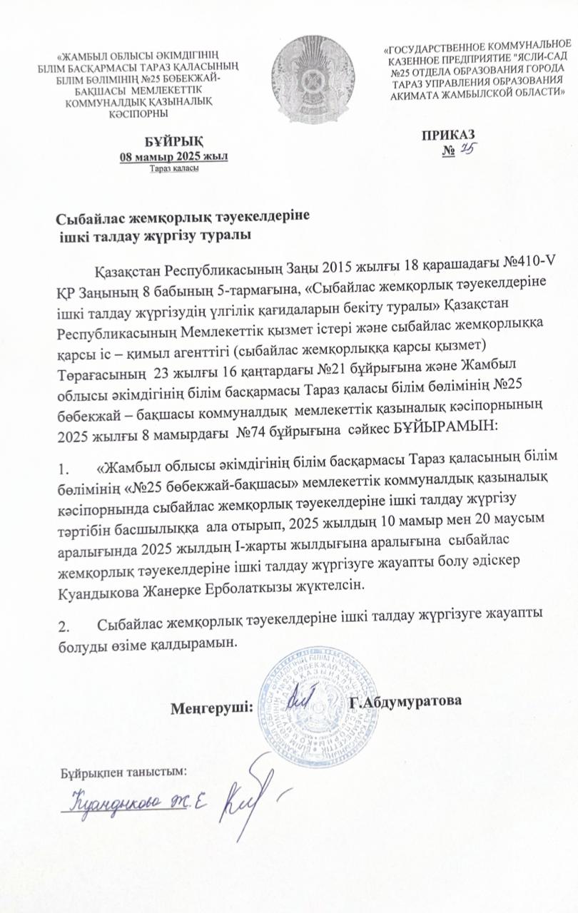 Сыбайлас жемқорлық тәуекелдеріне ішкі талдау жүргізу туралы » «№25 бөбекжай –бақшасы